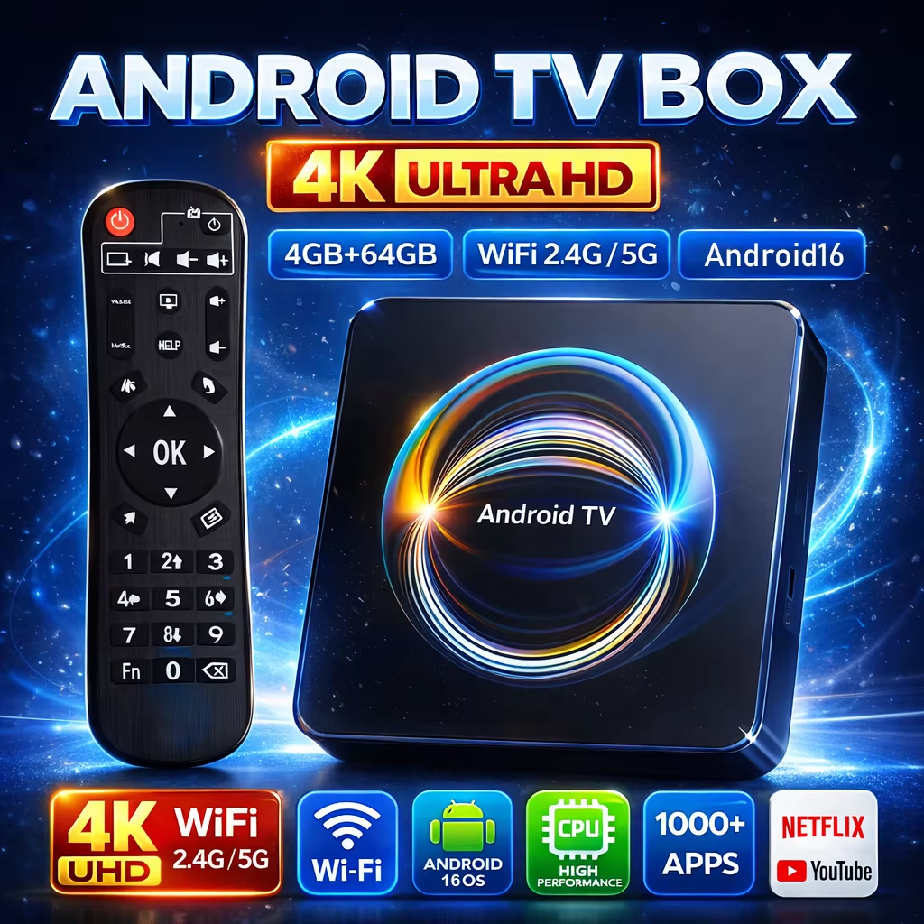 De afbeelding presenteert een krachtige, moderne en veelzijdige Android TV Box die ideaal is voor 4K-streaming, apps, online content en smart-tv-ervaringen. De combinatie van sterke kleuren, duidelijke iconen en technische visualisatie richt zich duidelijk op een technologisch onderlegd publiek met hoge kwaliteitsverwachtingen.